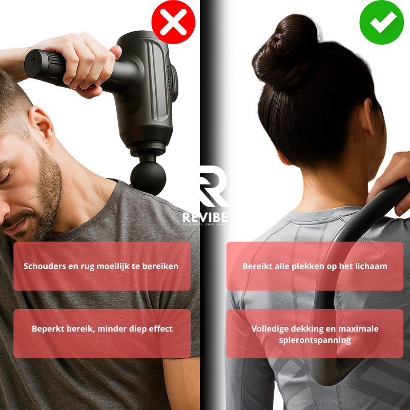 Traditionele massageguns zijn recht van vorm en lastig te gebruiken, waardoor het bijna onmogelijk is om je rug of schouders goed te masseren zonder hulp van iemand anders. Het resultaat is moeilijk bereikbare knopen, een incomplete behandeling en eindeloze frustratie.